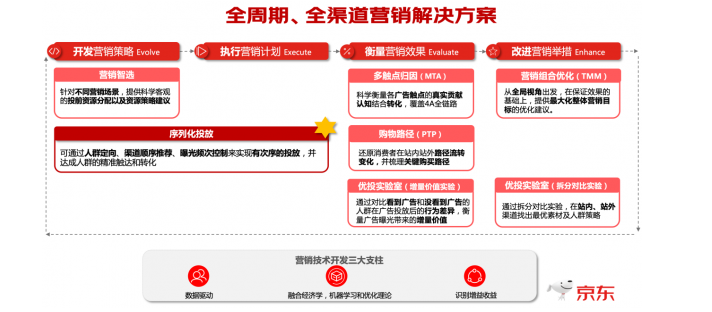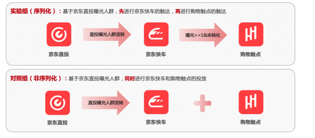 应用于序列化投放的渠道组合,当前包括了京东快车、京东展位、购物触点3大推广产品线,能够充分覆盖京东站内所有触达场景,以及用户由“逛”到“买”的购物全链路。为做到更为“有序”的投放,序列化投放基于每一类切分人群,还设置了相应的渠道序列,用最优的渠道组合和触达顺序来促成人群的转化。