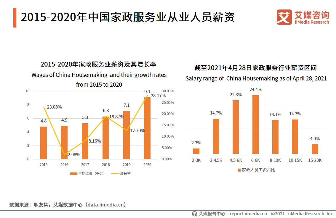 首先,家政整体薪资水平不断增长。实际上,过去几年中国家政服务业从业人员平均薪资不断增长,艾媒咨询发布的中国家政服务行业发展相关报告显示,2020年家政服务业的平均薪资就达到了9000元,到2021年,整体薪资区间在2000-20000元之间,其中,6000-8000的从业人员数量最多,占24.4%。