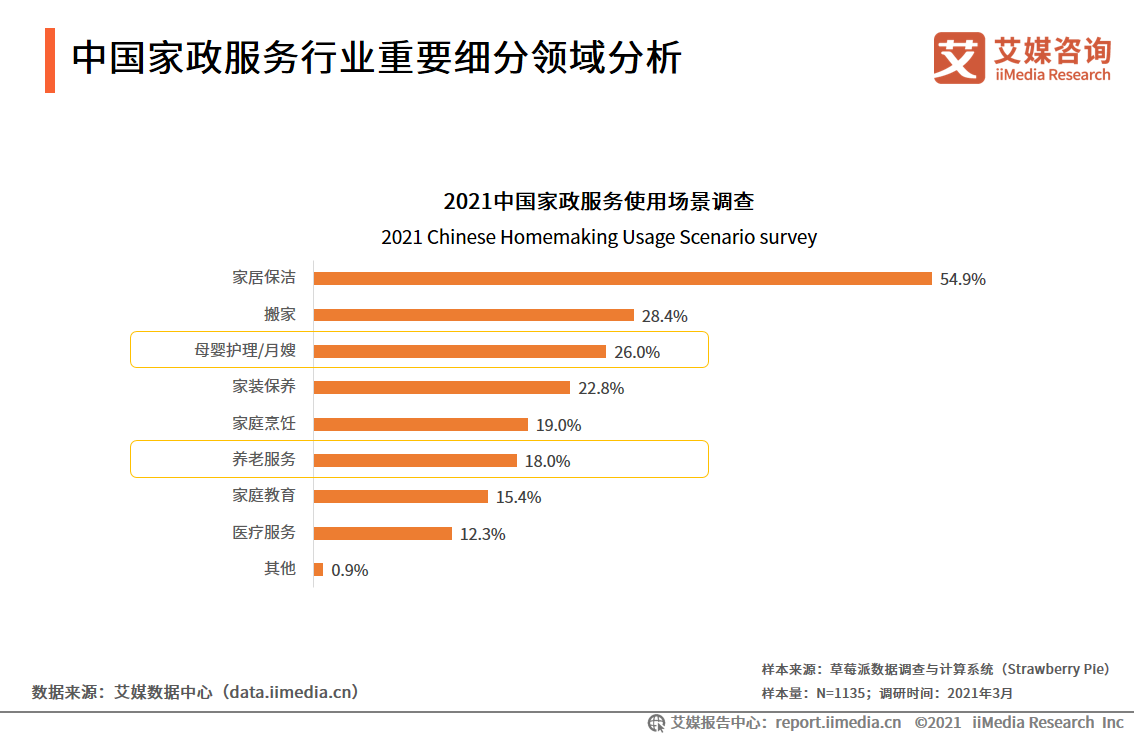 目前,家居保洁服务是家政服务中使用率最高的业务,54.9%的雇主选择家政服务主要用于家居保洁。此外,养老护理及母婴护理也是另外两大类家政服务场景,分别有26.0%和18.0%的雇佣者使用母婴护理、养老服务。