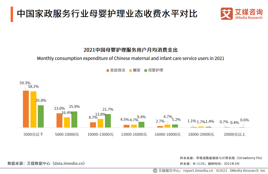 今年起,国家正式实施“三孩”政策,预计将会出现一波“三孩”小高峰。根据调查数据,母婴护理月均服务消费支出水平在家政服务当中是相当高的,月均消费在10000元以上的用户占比38.2%,16000元以上占比7.1%。“三孩”政策实施之后,母婴护理方面的家政需求只会有增无减。