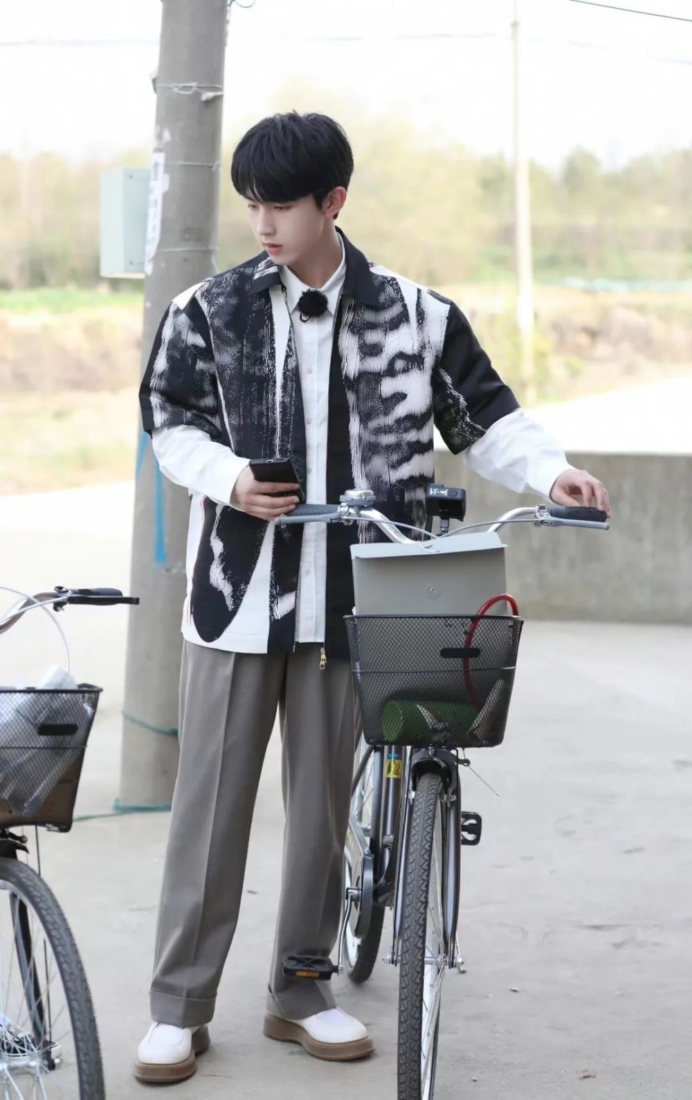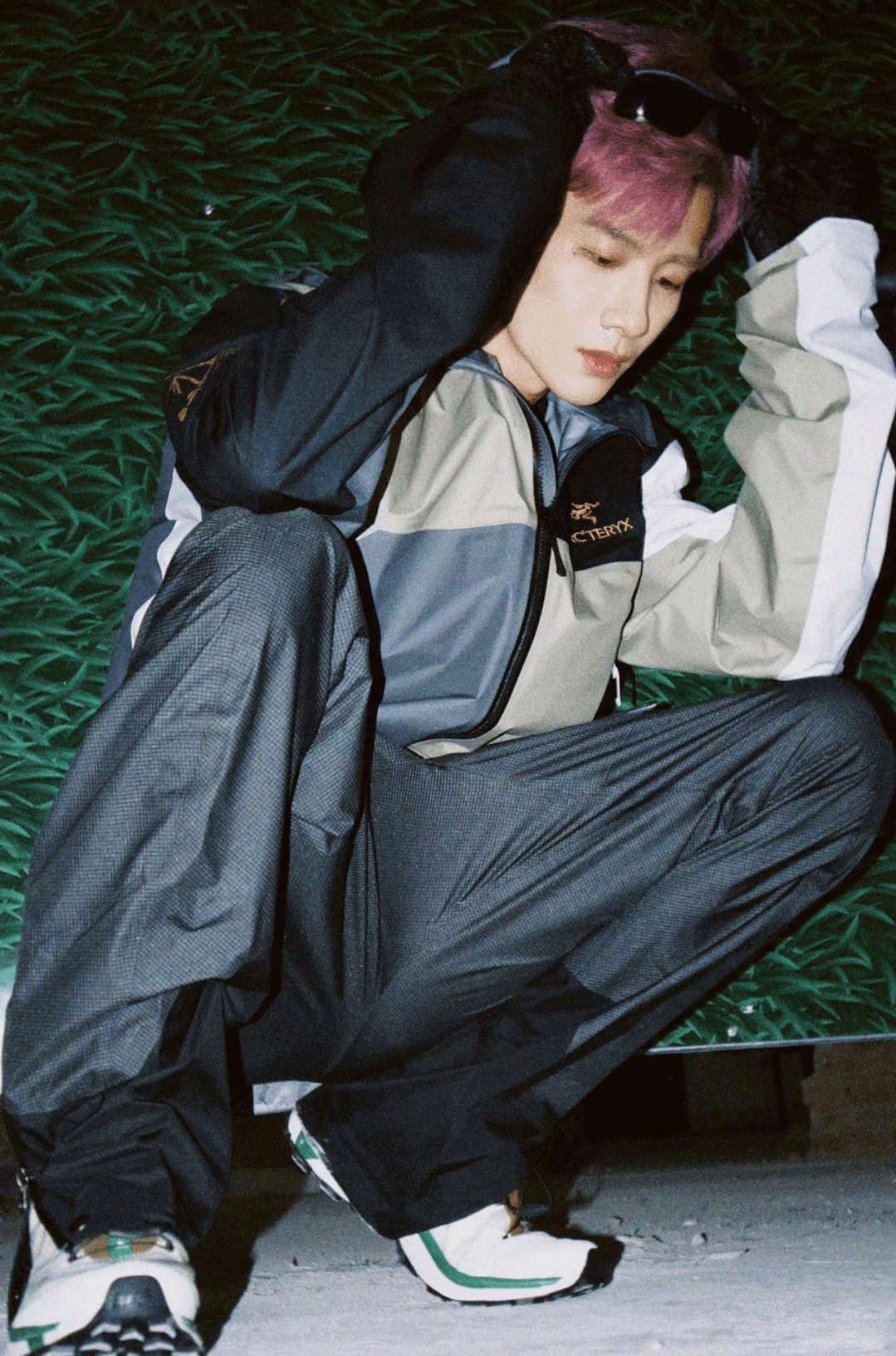 除了浅驼色,XT-6 MINDFUL还有很多其它配色可供选择,比如白敬亭就用清爽干净的白色可持续运动鞋加上一套拼接款花色的冲锋衣,搭配酷酷窄边墨镜,是山系穿搭的标准范本没错啦。