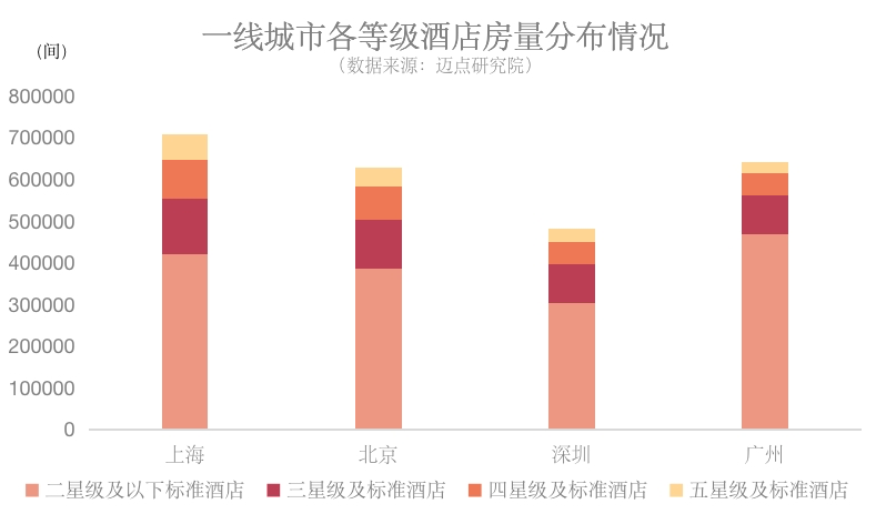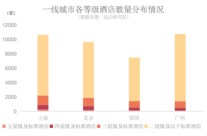 迈点研究院数据统计显示,三星级及以下标准酒店仍是一线城市的主流产品,其中上海酒店数占比91.87%、房源量占比78.23%;北京酒店数占比92.62%、房源量占比80.02%;深圳酒店数占比93.43%、房源量占比81.97%;广州酒店数占比95.61%、房源量占比87.52%。
